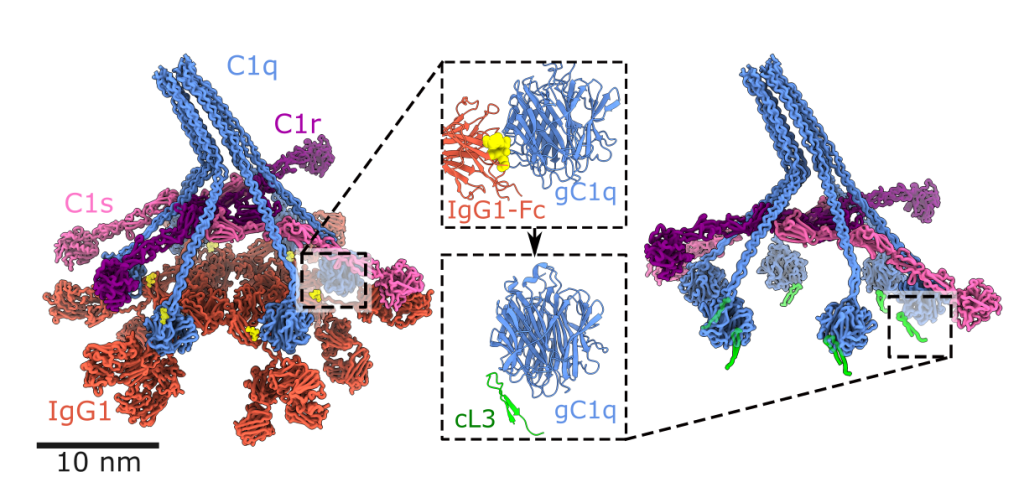 CryoEM is generally used on purified solution-phase biomolecules, such as the pentraxins C-reactive protein [25] and PTX3 [28], components of our innate immune system. These solution phase cryoEM structures usually represent the inactive state of immune components, which often require ligand binding to become activated.